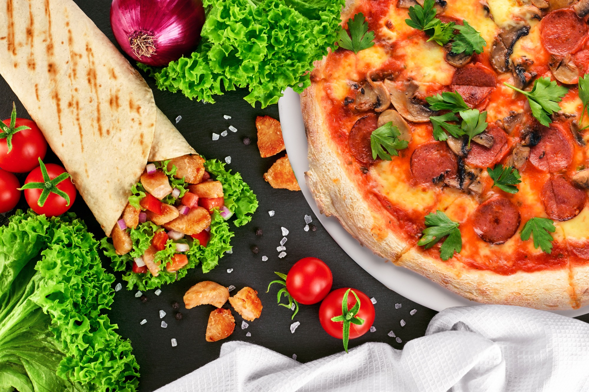 Tortilla pszenna (O 30 cm). Nadzienie: ryż /curry /świeże warzywa /sos czosnkowy /polędwiczka wieprzowa /filet z kurczaka / pikle /ser gouda /biała mozzarella /ser cheddar /salsa /śmietana opakowanie -